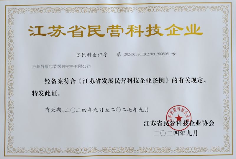 热烈祝贺苏州昇顺包装缓冲材料有限公司获评“江苏省民营科技企业”!这一荣誉是对公司深耕包装缓冲材料的创新能力与产业化成果的高度肯定。我们将立足长三角科创高地,持续加大研发投入,以科技赋能产业升级,为区域经济高质量发展注入新动能!